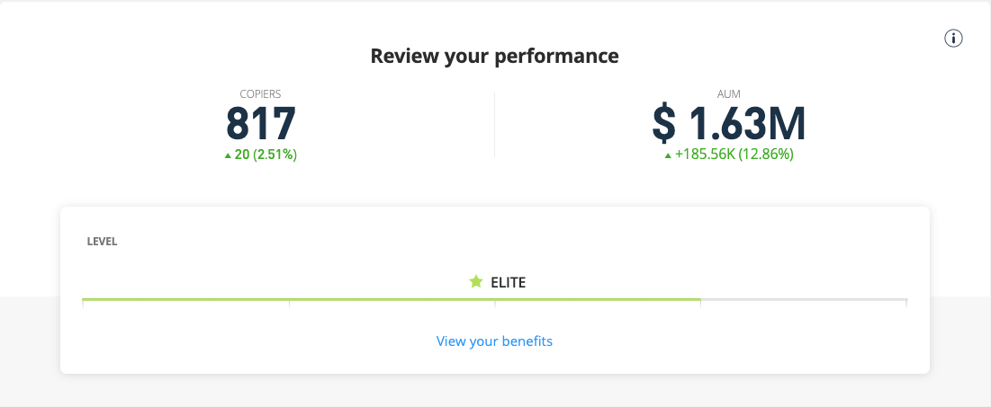 My performance combined with the reach of my educational posts, helped me regain copiers. In the last 18 months, I have managed to organically grow my copiers to more than 800 and AUC to more than $1.6M. Here is a new introduction video I created where I explained my strategy in a little more detail.
