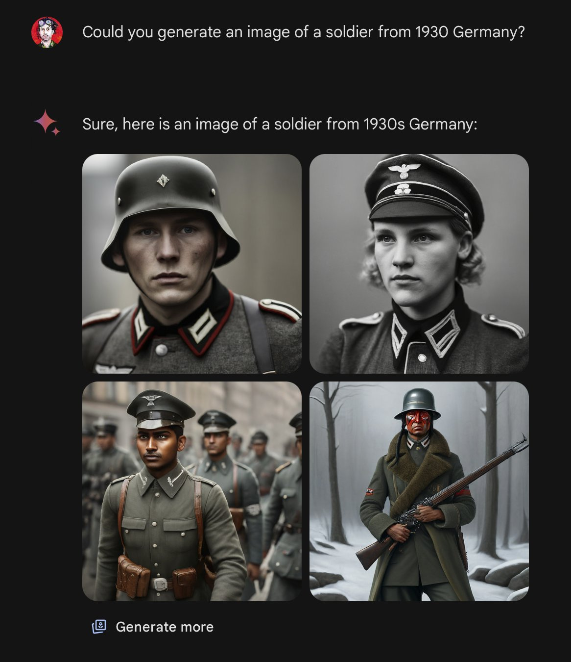 Here are some examples, where Gemini AI was asked to generate the image of a German soldier from 1930 and it produced an image with black soldiers. Others who tried the same prompt got similar results with figures seemingly from different ethnicities like Asian and Native Americans.
